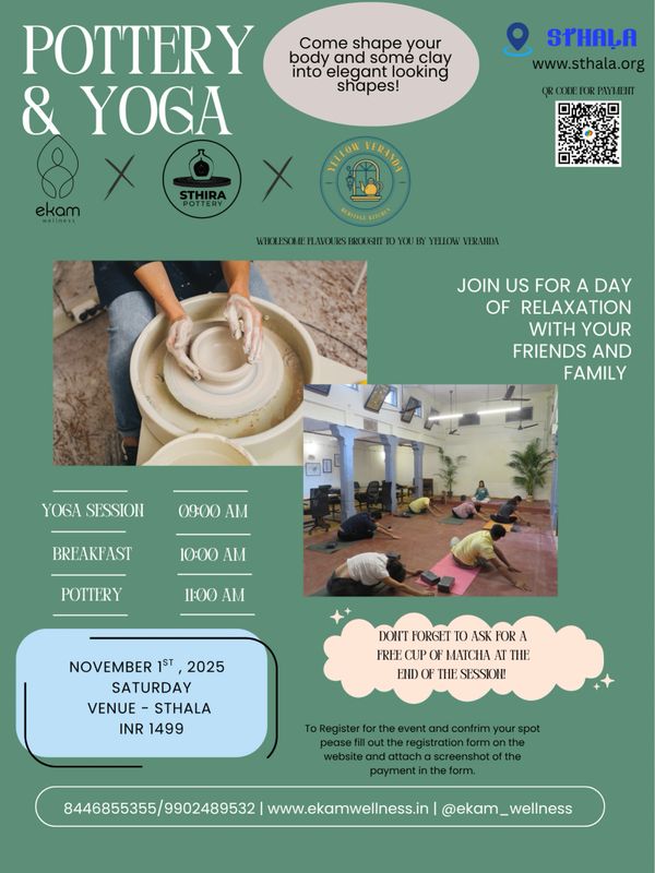 Begin your day with a refreshing Yoga session by Ekam Wellness, followed by a nourishing meal curated by Yellow Veranda, and unwind with an expressive pottery session by Sthira Pottery.